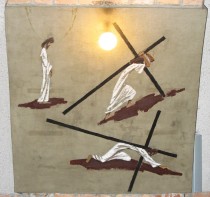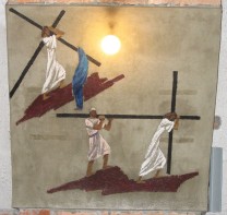 Na filarach dolnego kościoła artystka namalowała na tynku sześć malowideł ze stacjami Drogi Krzyżowej (1975 r.)